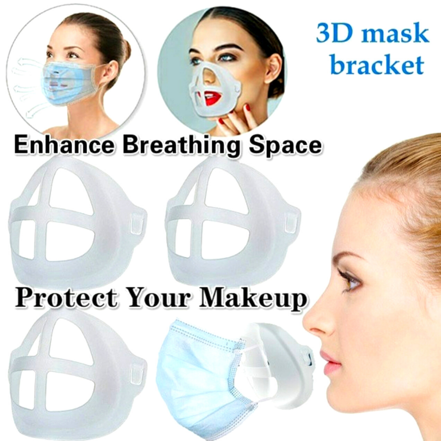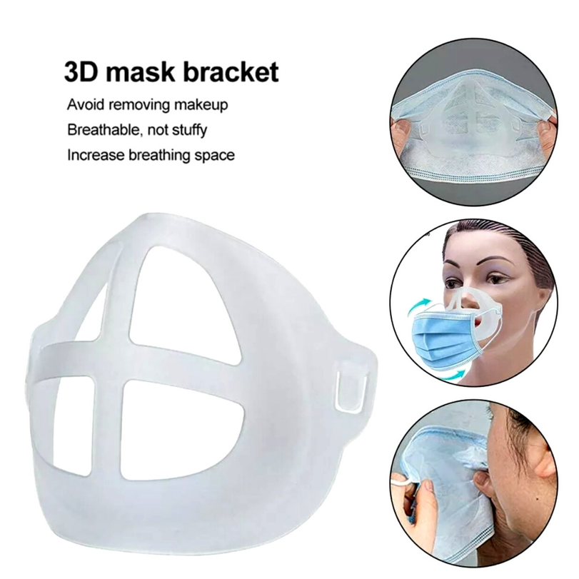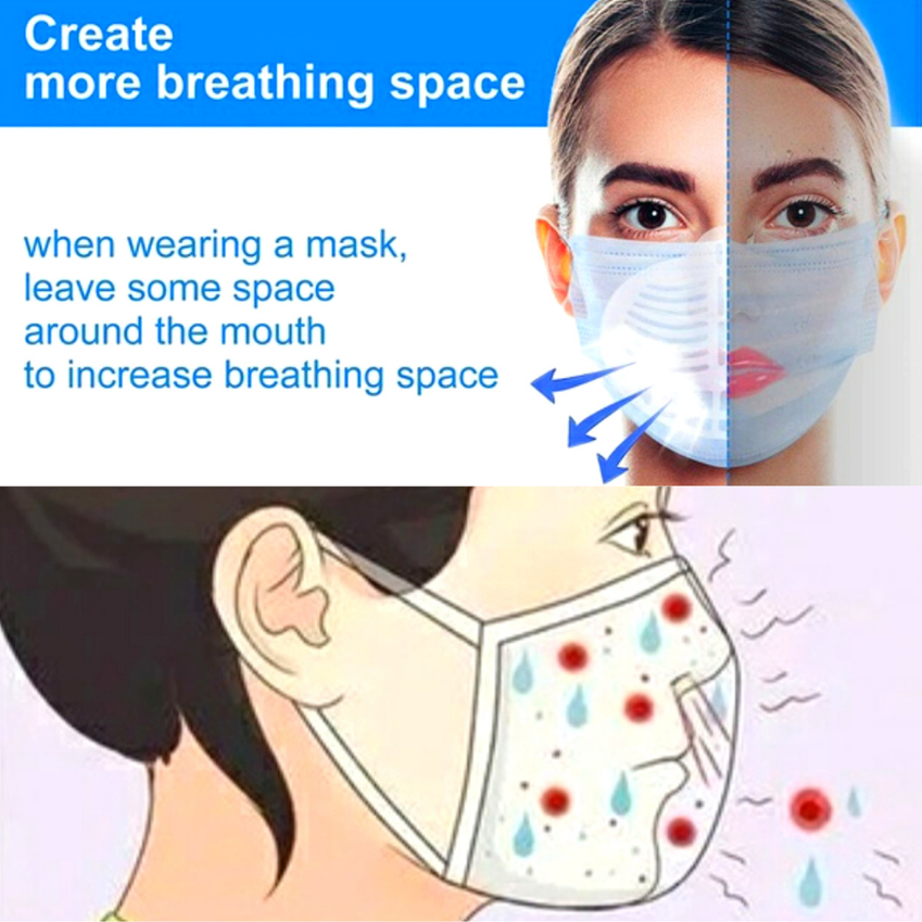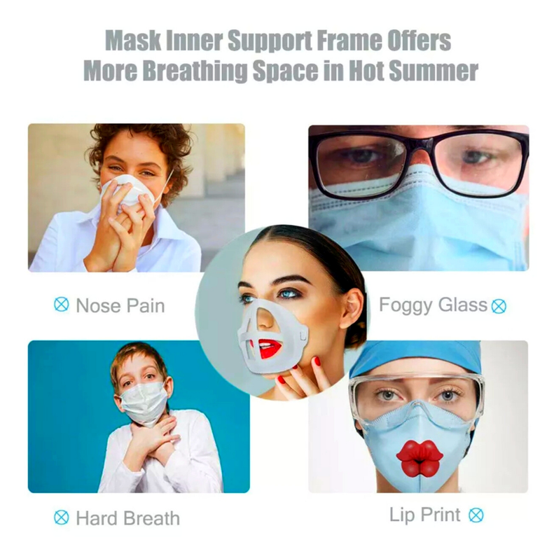 Features: 1.Easy to Breathing - It holds up the mask fabric around the mouth to create more breathing space when a mask is put on face. 2.Cleaner for Wearing - The bracket reduces the friction frequency between mask and face to protect the lining from getting stained. 3.Lipstick Protection - It makes the mask not to stick lipstick, protecting your perfect makeup from being messed up.n face. 4.Washable and Reusable - Food grade silicone material is safe, washable and reusable.