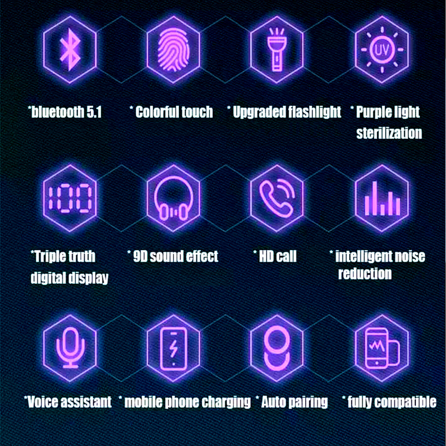 Specifications: Using Bluetooth V5.1 chip and having stable performance, high transmission, low power consumption and strong compatib distance makes it super convenient and practical for you to use. Having ergonomic design so it is more comfortable for you to wear in daily life. Binaural split design can separate one ear, which is equivalent to two independent Bluetooth headsets. Comes with strong compatibility so it can fit most types of mobilephone. With button control design makes it simple and stylish. Item Name: Bluetooth Headphones Type: 3 Digital Display Bluetooth Version: 5.1 Space Print Version: CVC 8.0 Frequency Range: 2402MHz-2480MHz Transmission Distance: 10m Charging Input Voltage and Current: 5V Battery: Built-in Battery (Included) Mobile Phone Main Battery Capacity: 50mAh Rechargeable Battery Capacity: 2000mAh Features: Bluetooth 5.1, Wireless, Fine Workmanship Size Details: Bluetooth Headphone Size: 2.85cm x 1.7cm x 3cm / 1.12 "x 0.67" x 1.18 "(Approx.) Charging Box Size: 8.2cm x 4.8cmx 3cm / 3.23 "x 1.89" x 1.18 "(Approx.) Notes: Due to the light and screen setting difference, the item's color may be slightly different from the pictures. Please allow slight dimension difference due to different manual measurement. Operation method: ility.Featuring 10m connection mes continuously when power on