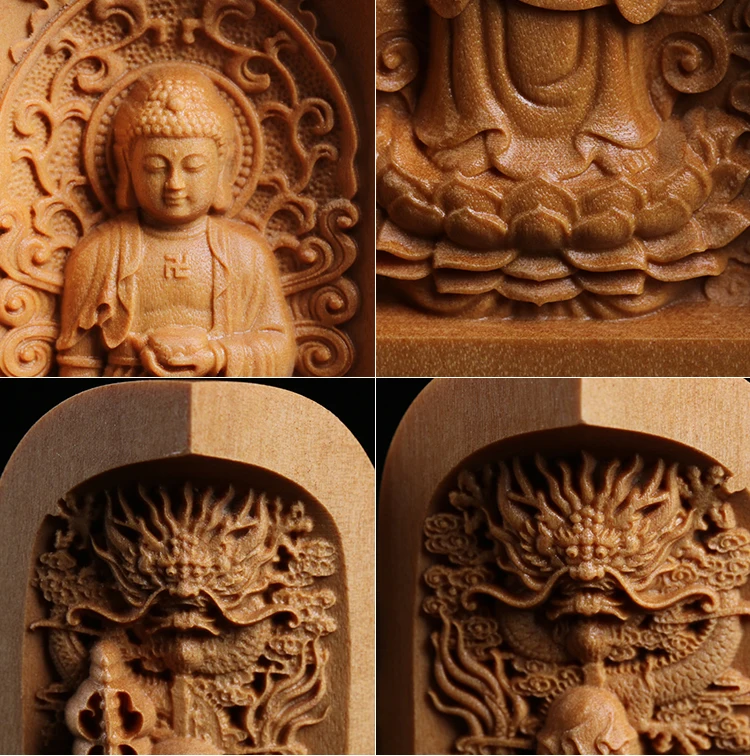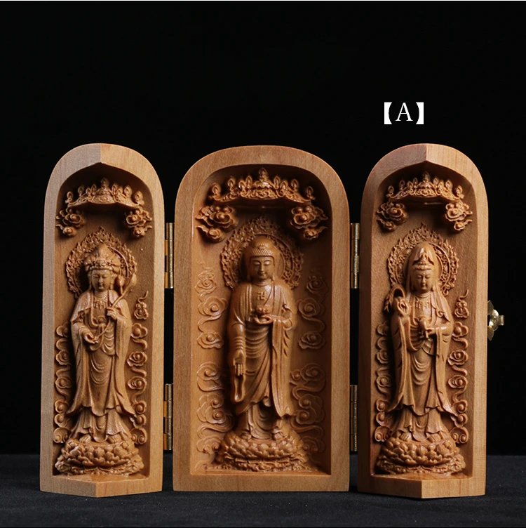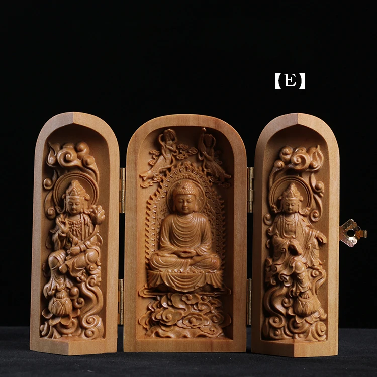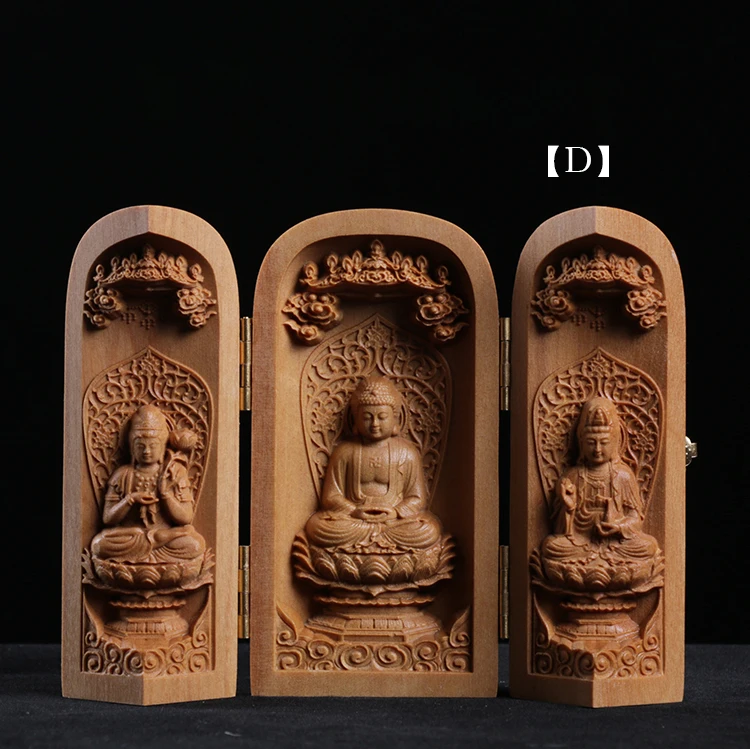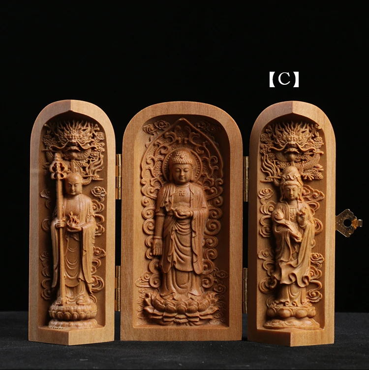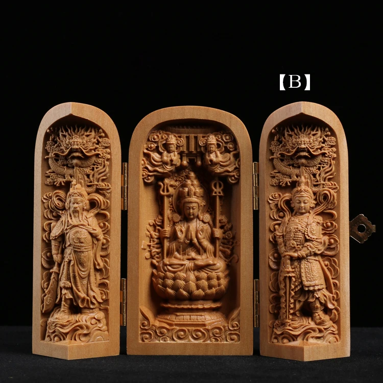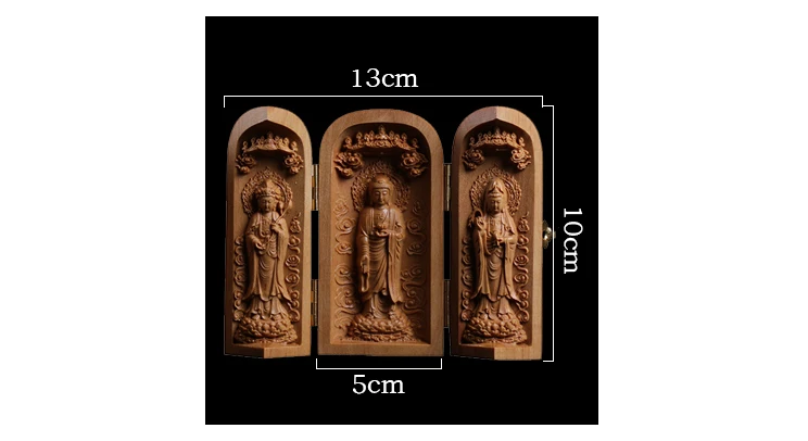 Buda Sandalwood Carving Home Feng Shui Home Decor Buddha Shrine Guanyin Statue Three Open Box Sculpture