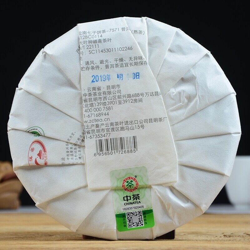 Product detail: Product name: 2019 Zhong Cha Ripe Puer Tea 7571 Shu Puerh Cake 357g Packing specification: 357g / Pcs Storage: Avoid sunlight, ventilation places Shelf time: The longer the better