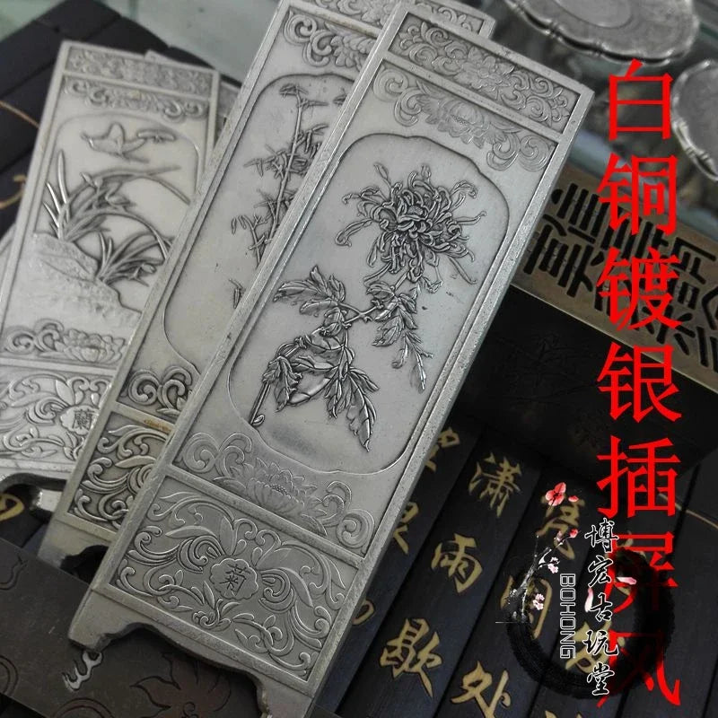Chinese Collection Tibetan Silver Carving Antique Folding Screen Plum Orchid Bamboo and Chrysanthemum Copper