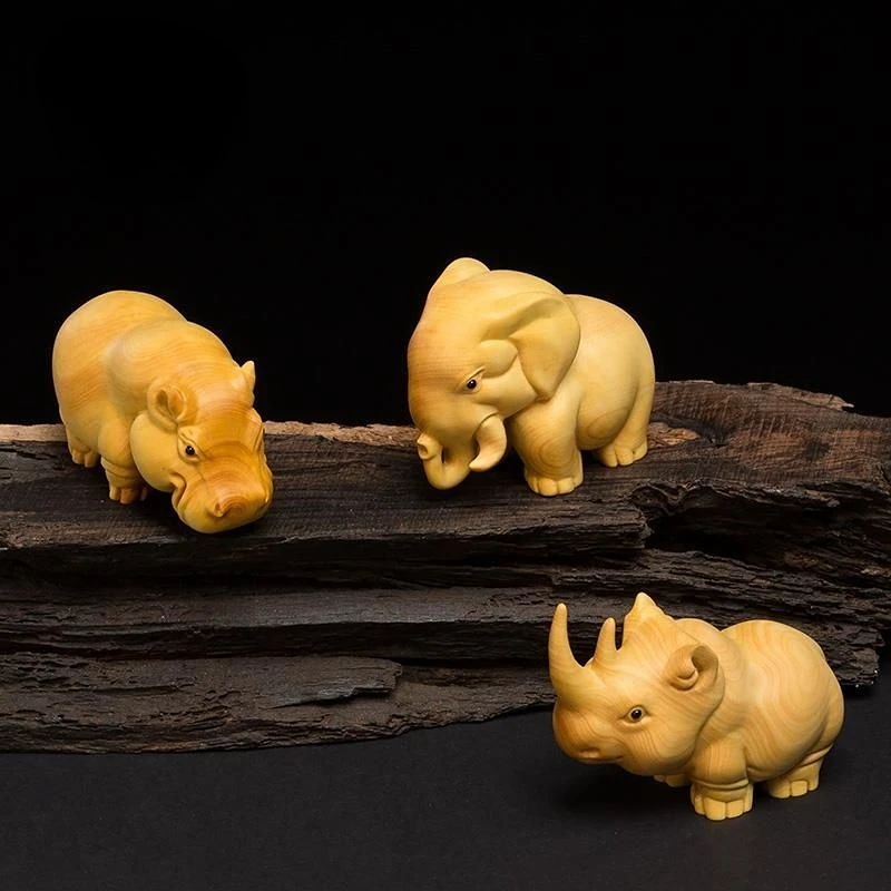 Cliff Cypress Wood Carving【Bring Wealth Lucky-Rhinoceros elephant hippopotamus】Originality Home Decoration Sculpture Modern Arts
