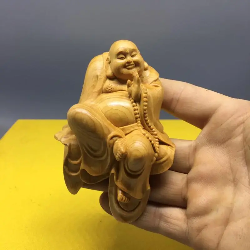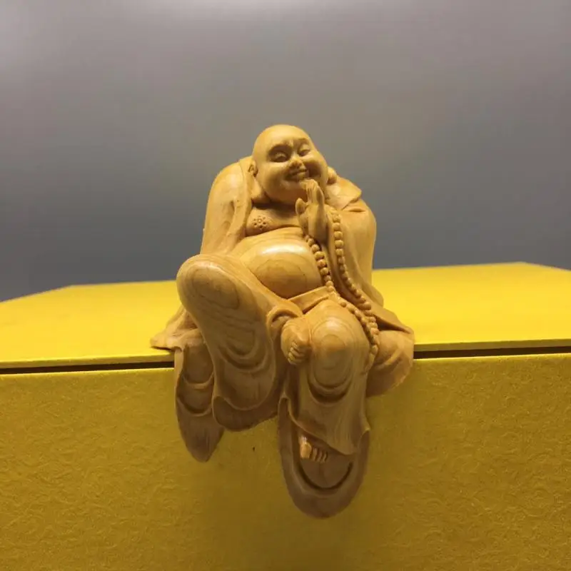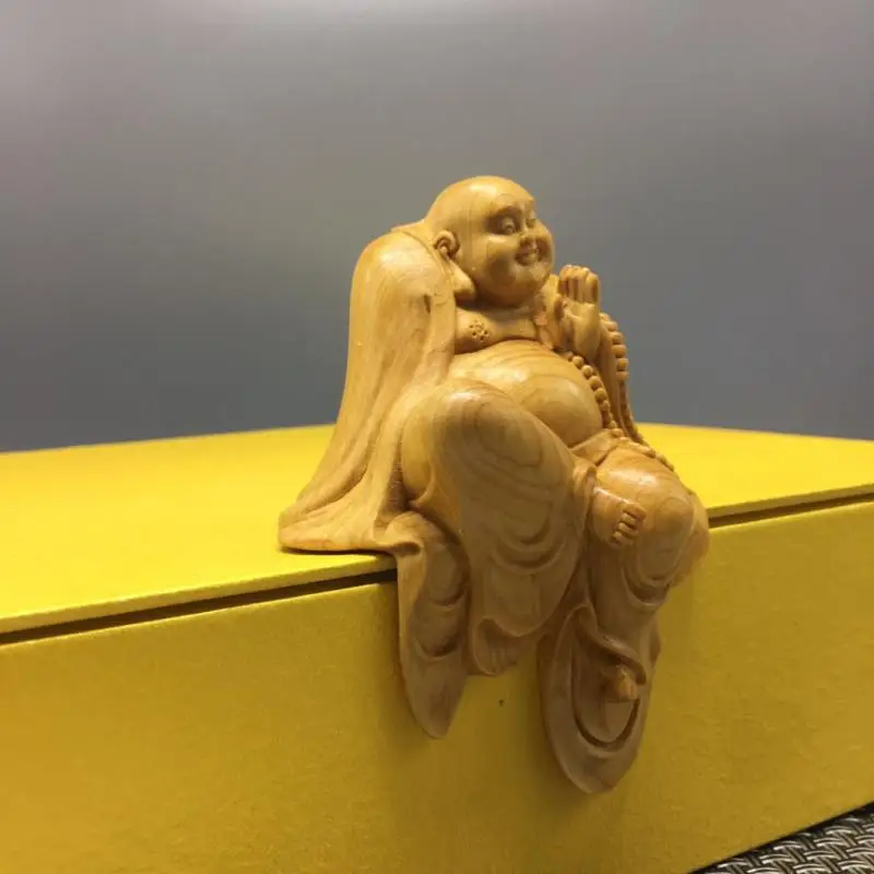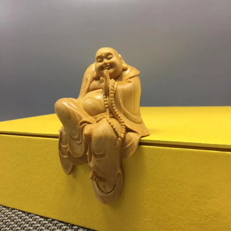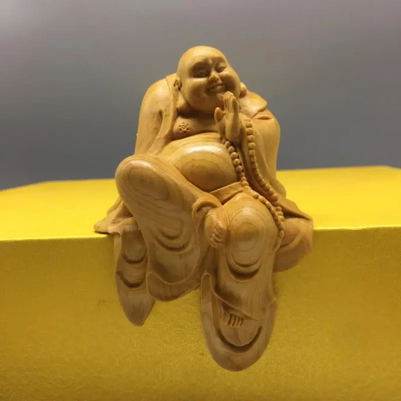 Cliff cypress wood carving, Zen Maitreya Buddha statue decoration, living room, TV cabinet decoration, Chinese style home