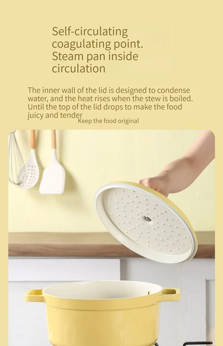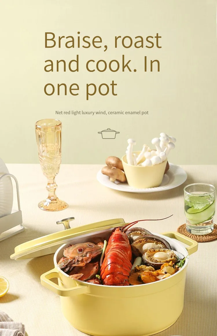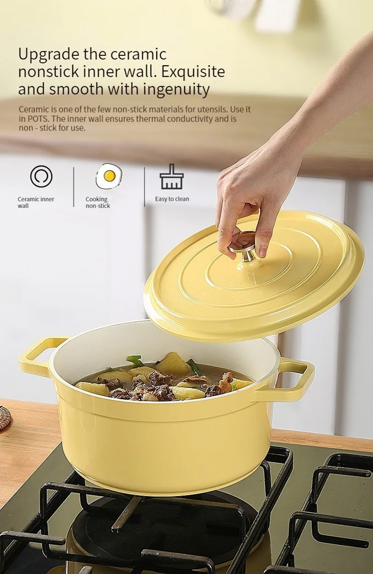 Thermal Storage and Heat Preservation aluminum alloy oven pot with the characteristics of cast iron, long-term heat preservation is achieved.Enameled Cast Aluminum has a glossy, nonstick surface perfect for making stir-frying, braising, stewing, baking etc