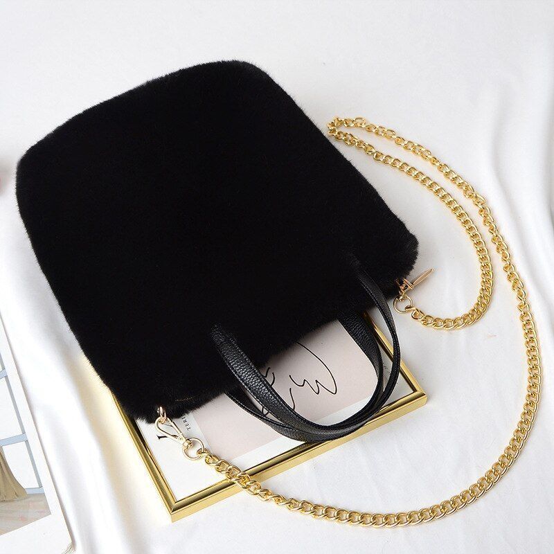 Fluffy Tote Bag Sling Chains Shoulder Strap Crossbody Faux Fur Bucket Handbag