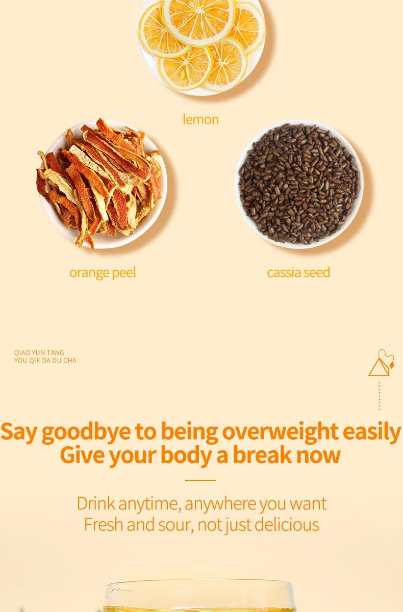 Product ingredients:Cassia seed, hawthorn, lotus leaf, lemon slices, tangerine peel