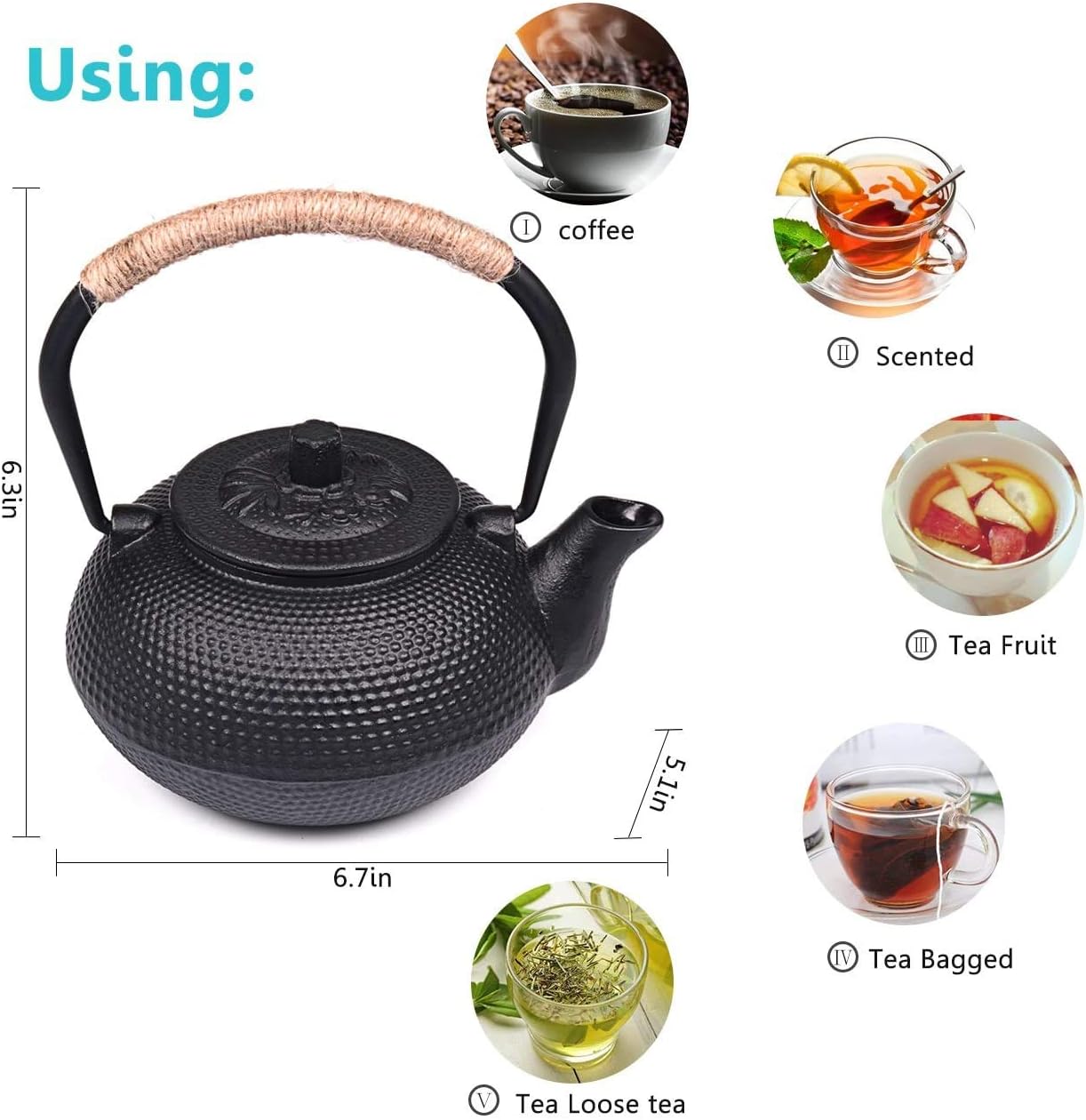 Suyika teapot is built with an infuser for loose leaf tea to maximize the flavor and aromas and has a cast iron body to preserve heat.